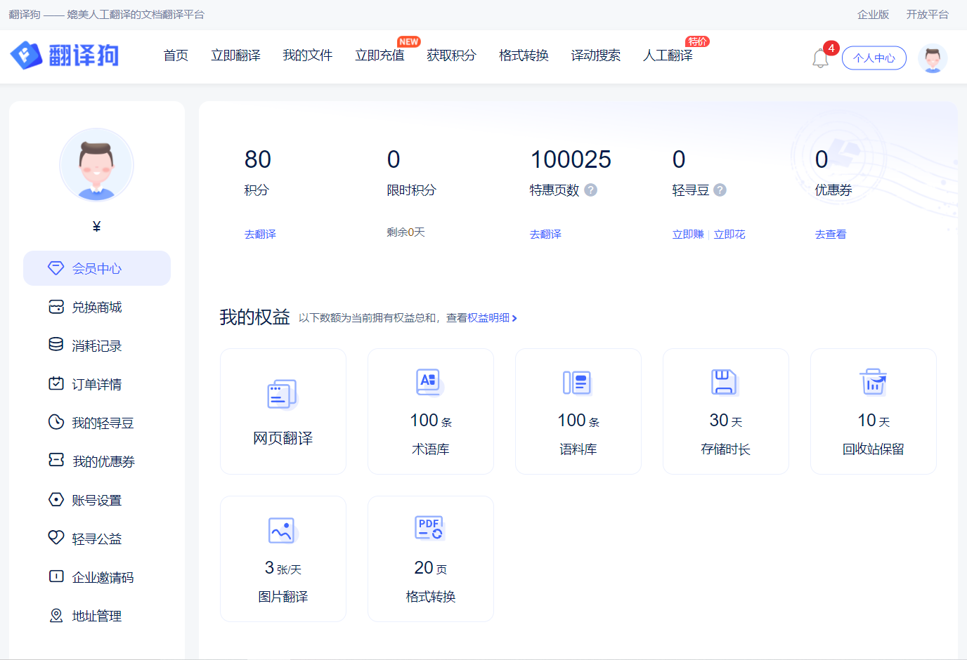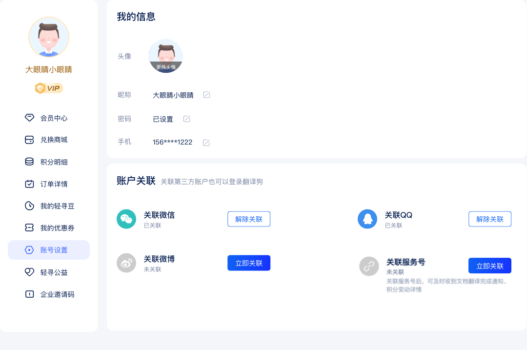 点击个人头像,即可进入个人中心页面,该页面的功能会根据用户类型(会员、企业用户)不同而开放不同的功能,会员版包含七大功能:“会员中心”、“兑换商城”、“积分明细”、“订单详情”、“我的轻寻豆”、“我的优惠券”、“账号设置”(企业版功能见下文)