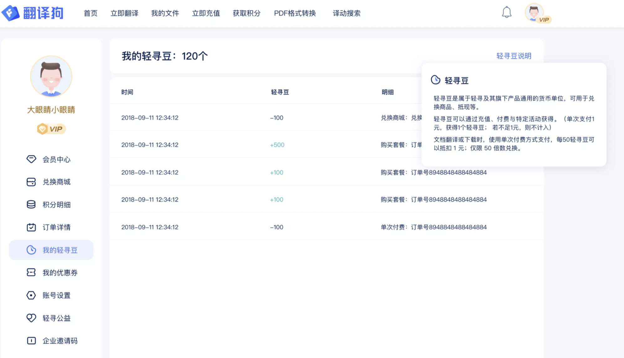 该页面可以查看个人账户剩余轻寻豆,及轻寻豆获得、消耗明细