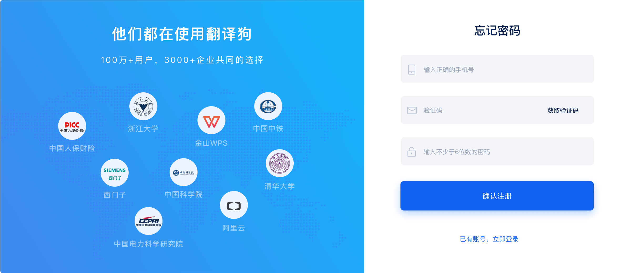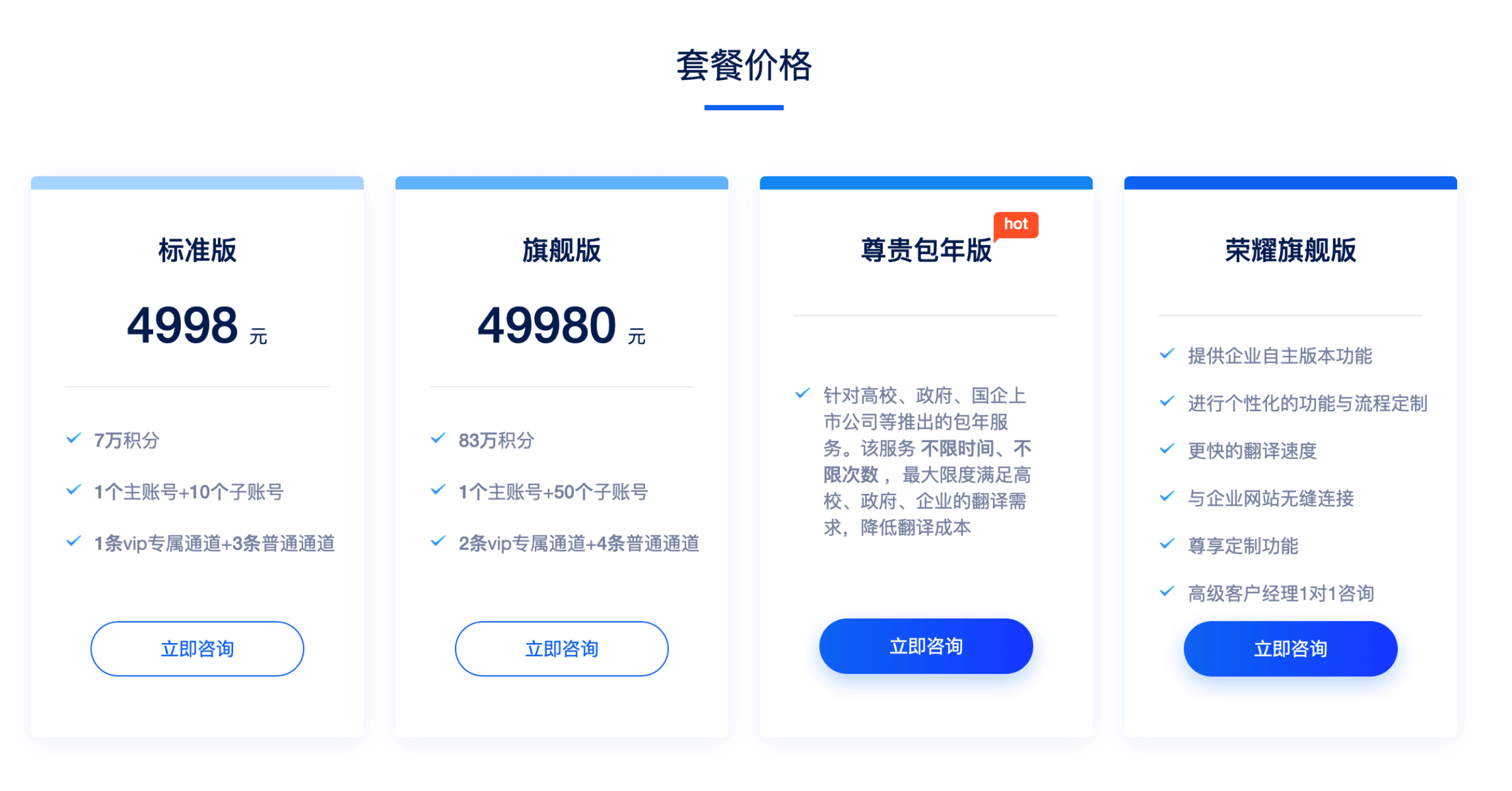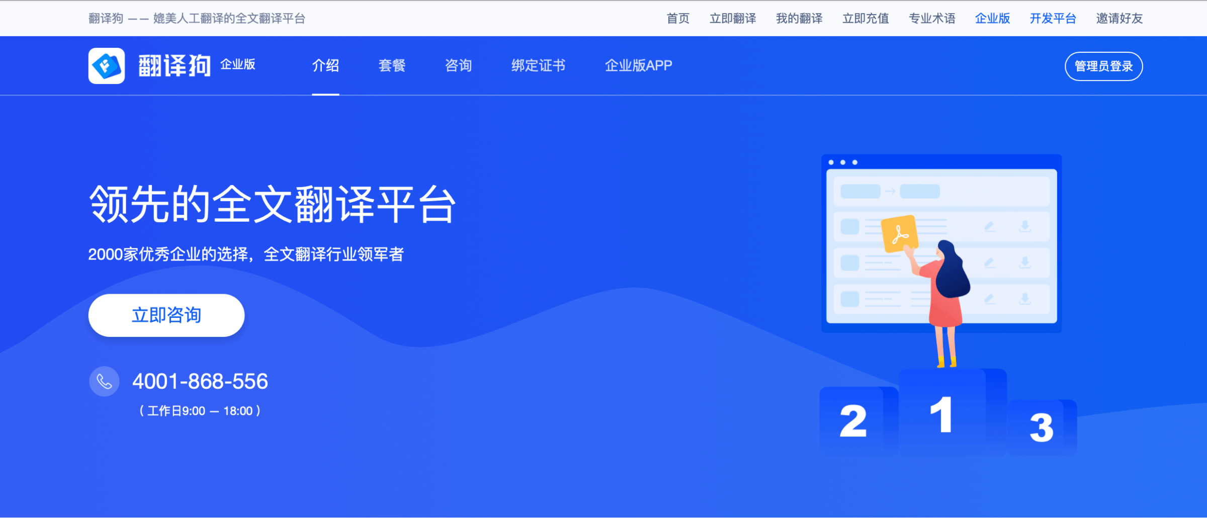 用户可点击“立即咨询”,留下相关信息,翻译狗会派专业的顾问与之联系,也可以通过首页联系方式主动电话咨询。购买企业版套餐,将获得企业管理员账户,用于对公司成员进行管理