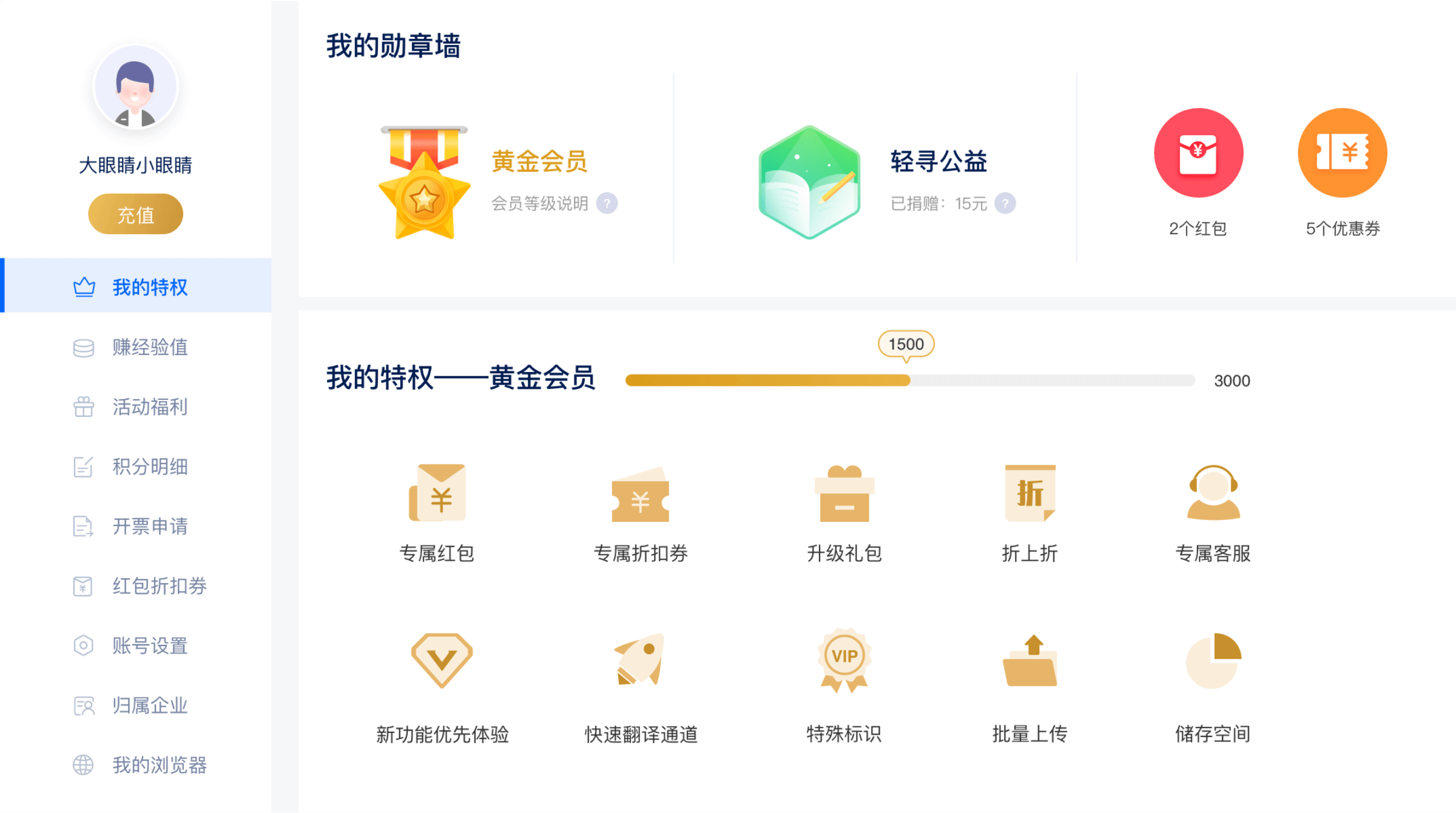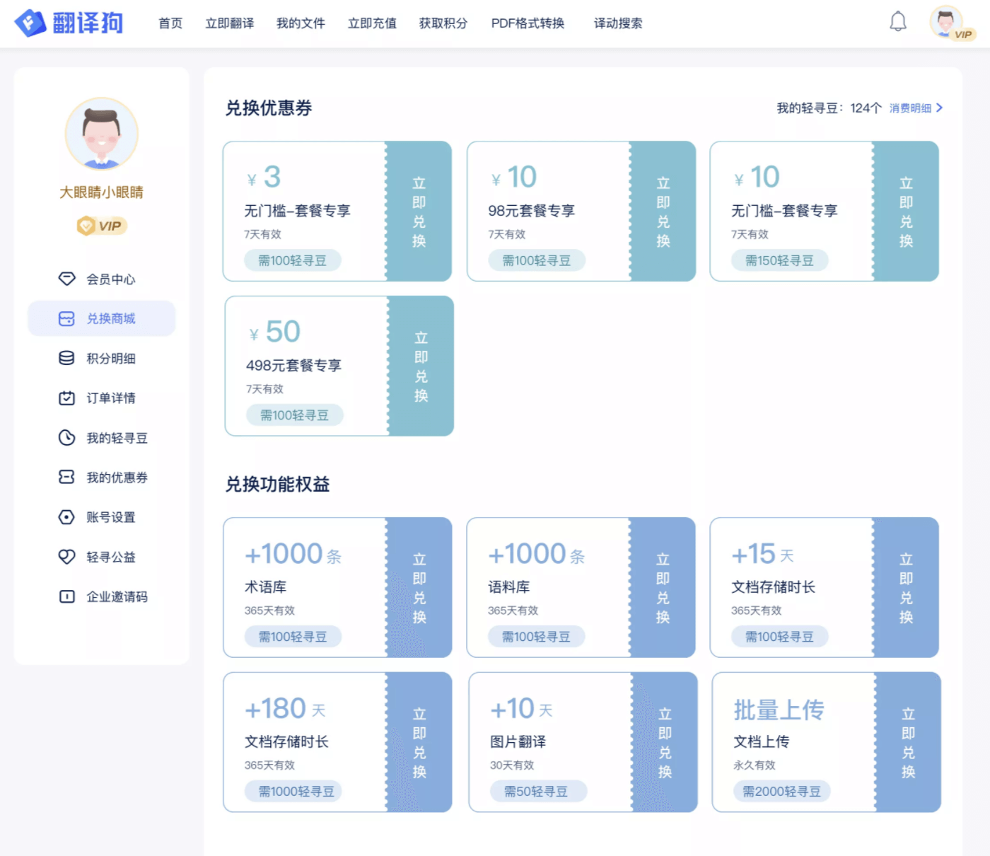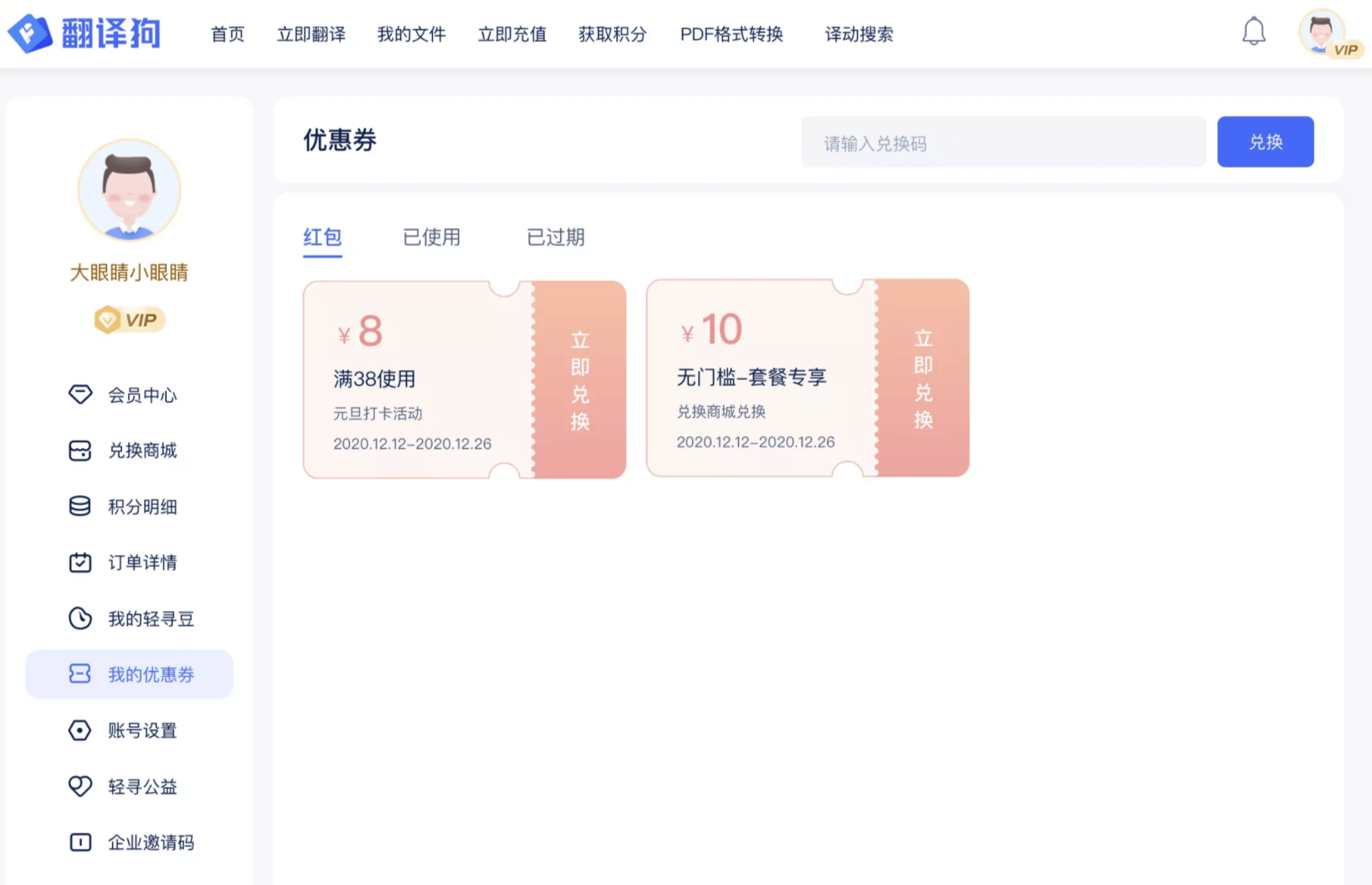 用户参加翻译狗的各类活动可获得优惠券,分为兑换券和满减券。