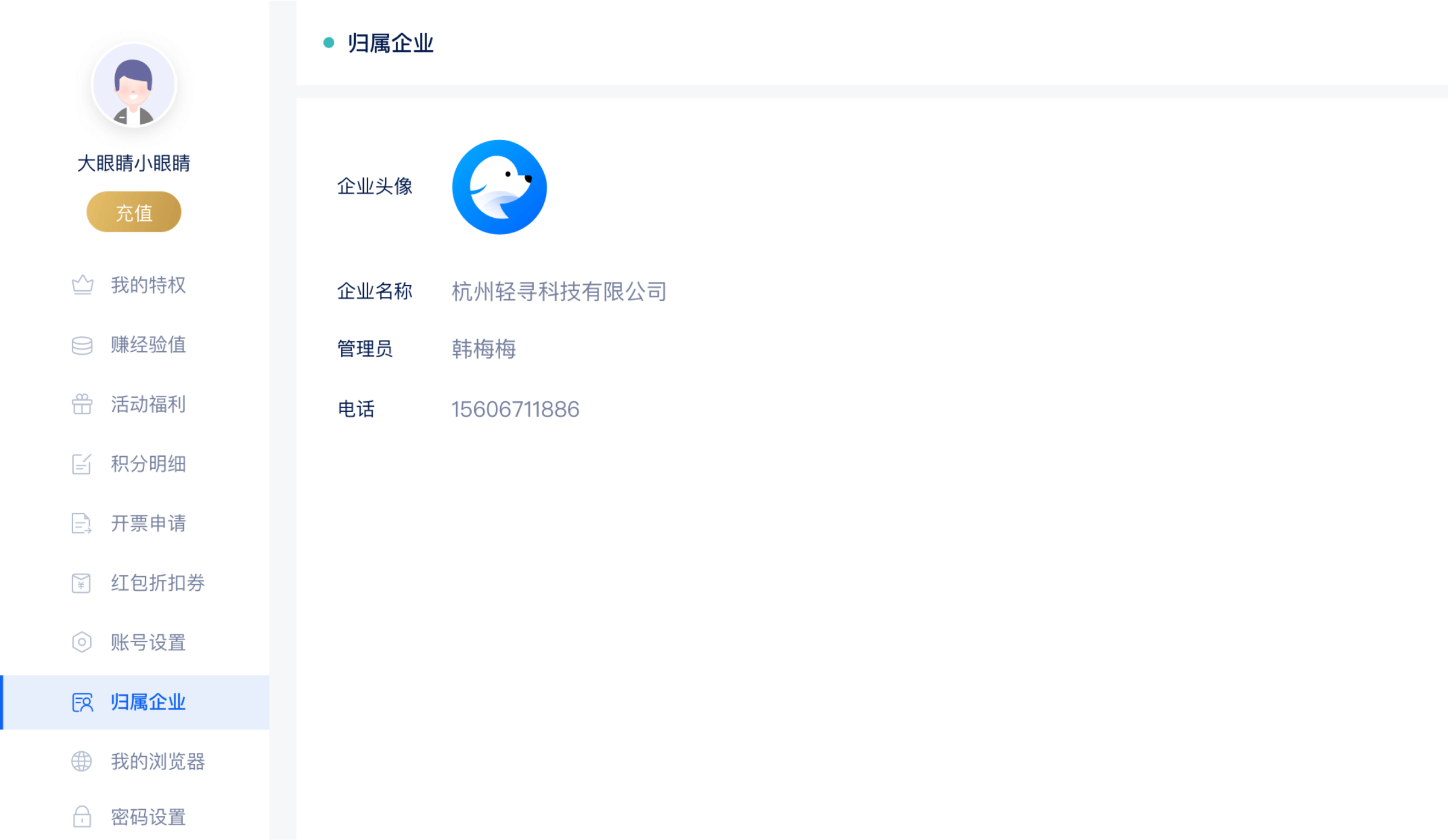 购买了翻译狗企业版的用户,可以在这里看到他所属公司的信息,其中包含:企业头像,企业名、管理员、管理员电话