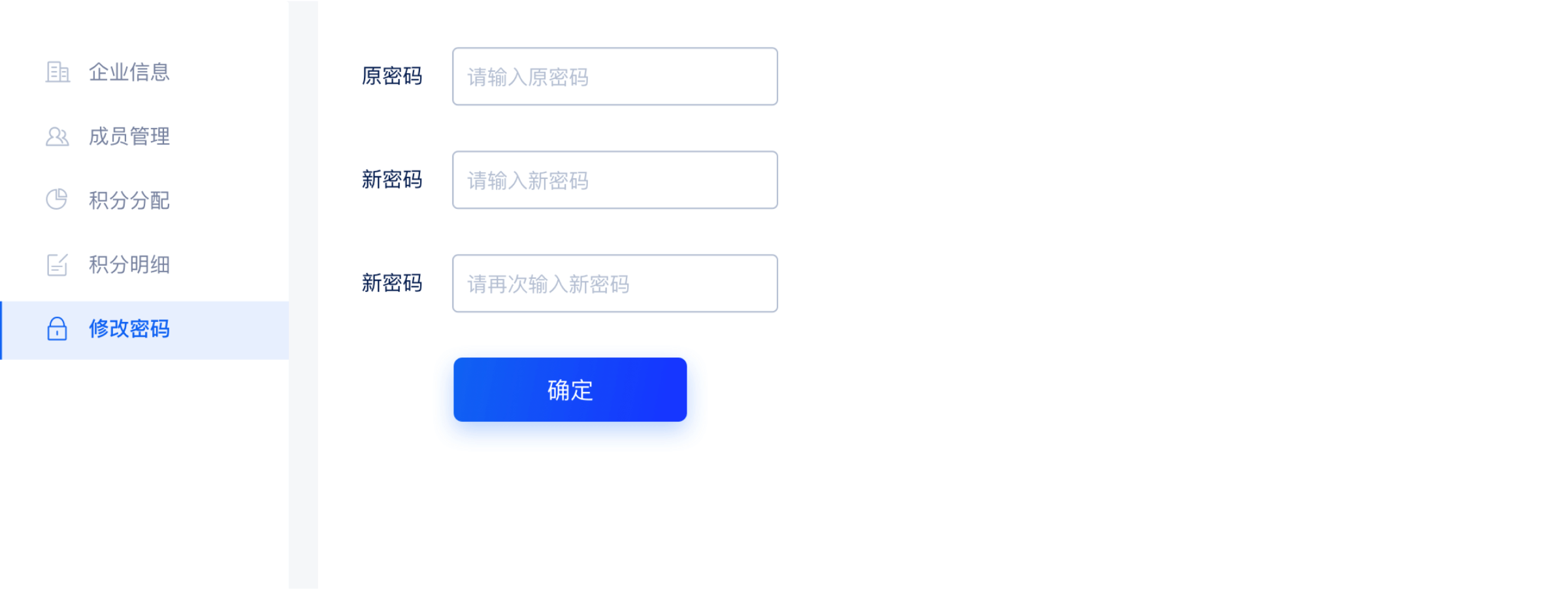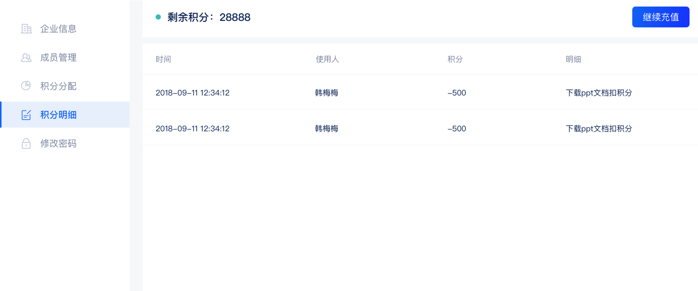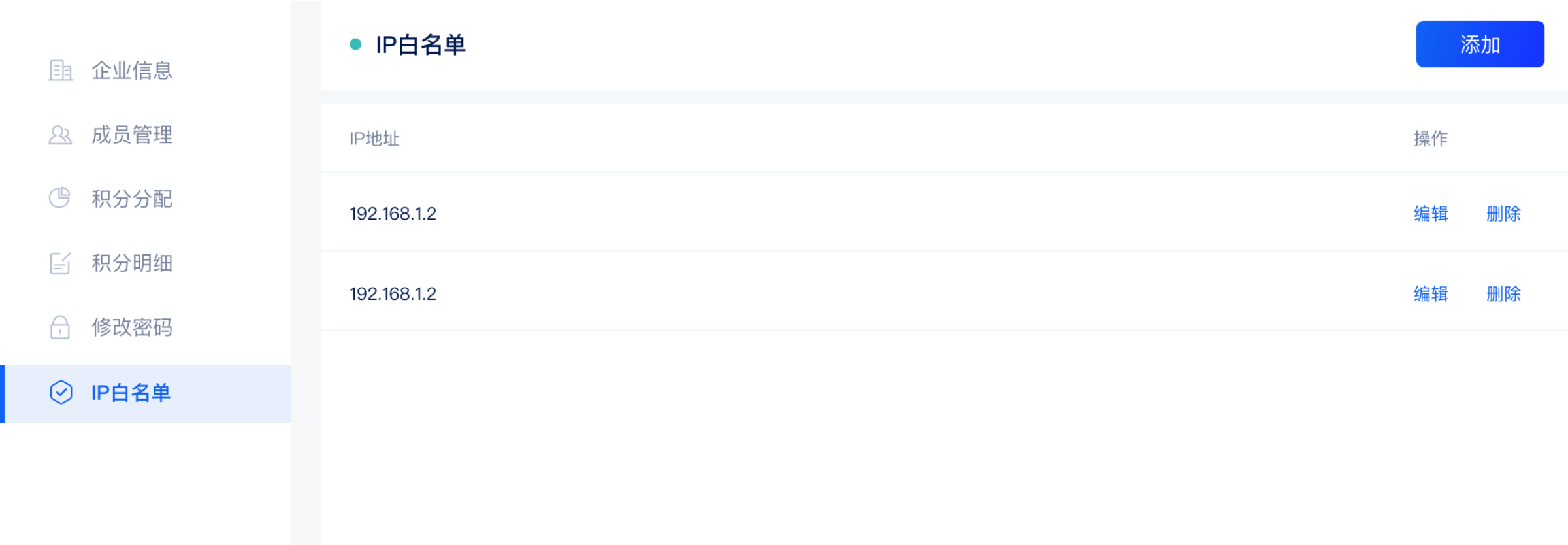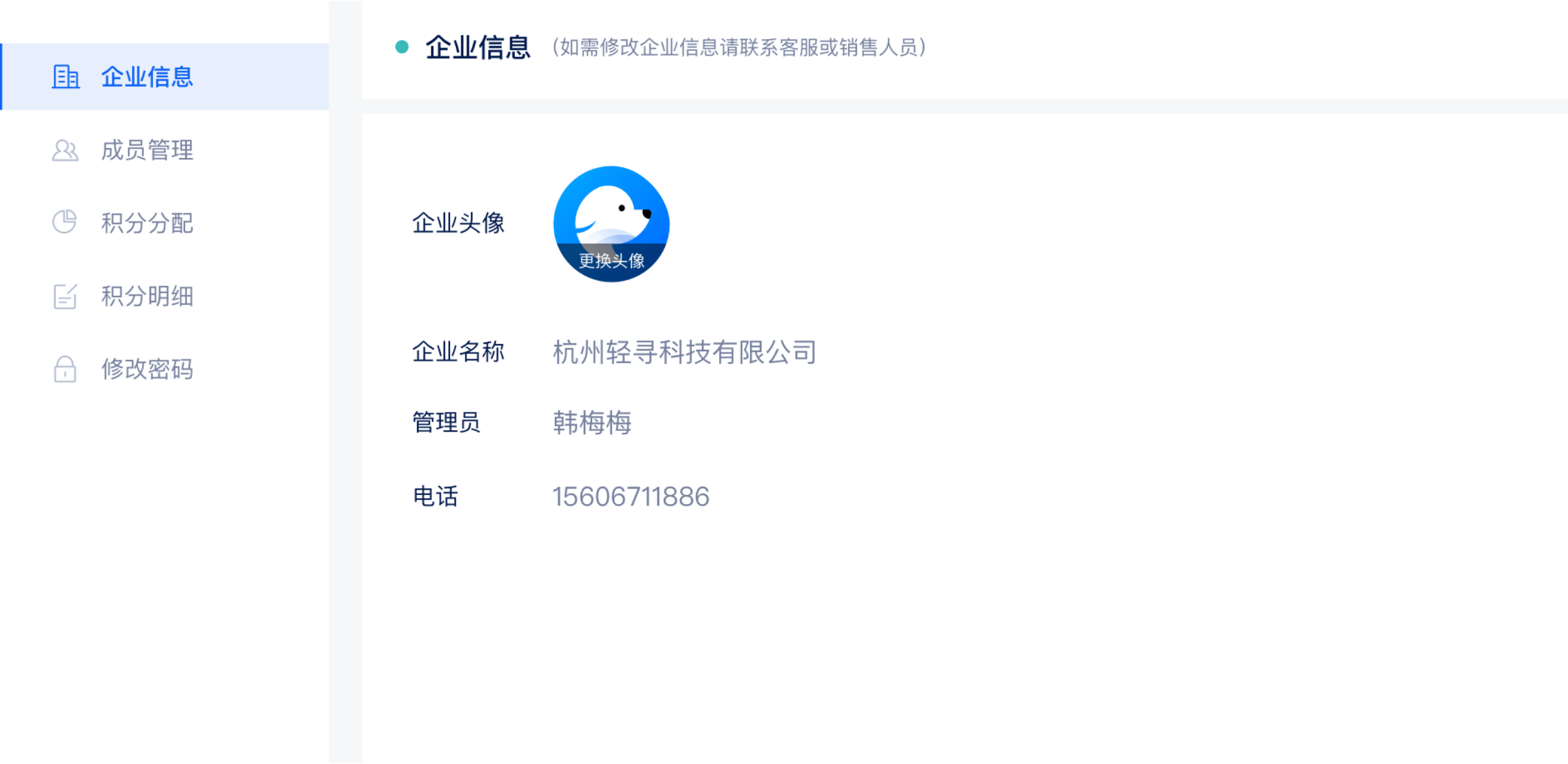 点击管理员登录后,可以看到“企业信息”、“成员管理”、“积分分配”、“积分明细”、“IP白名单”、“修改密码”几个功能