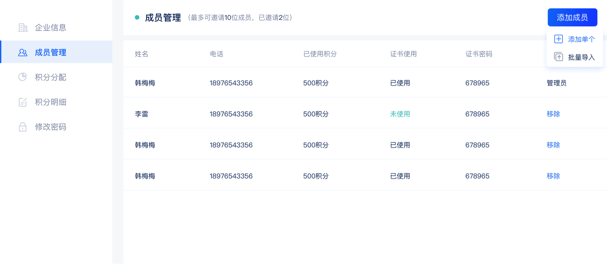 不同套餐会有不同的添加成员限制。添加成员:可以逐个添加,也可以通用Excel表格批量导入;成员移出:只要点击“移出”按钮就可以将其移出。若企业购买了安全证书的功能,则可以看到证书使用状态,还将显示证书密码并发短信告知成员