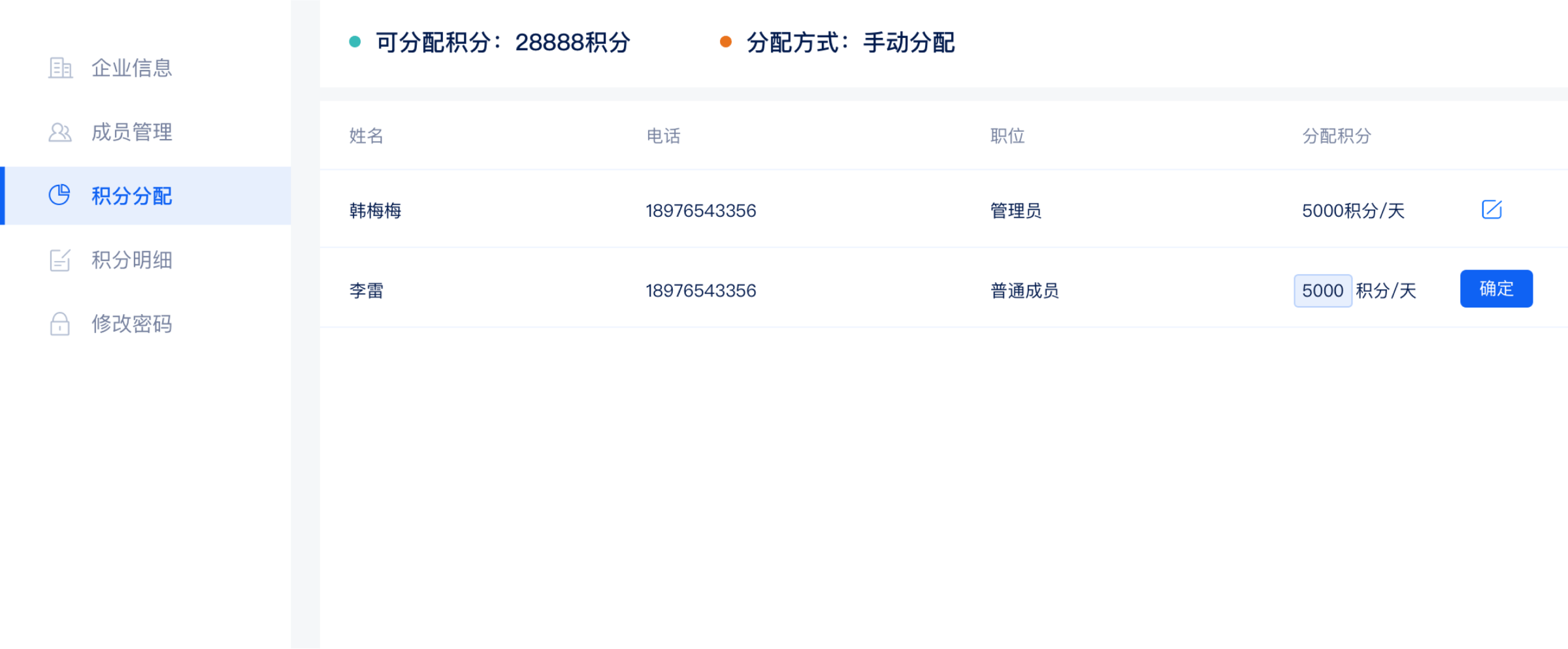 该页面可以看到可分配积分及成员信息,点击后面的修改按钮即可分配积分