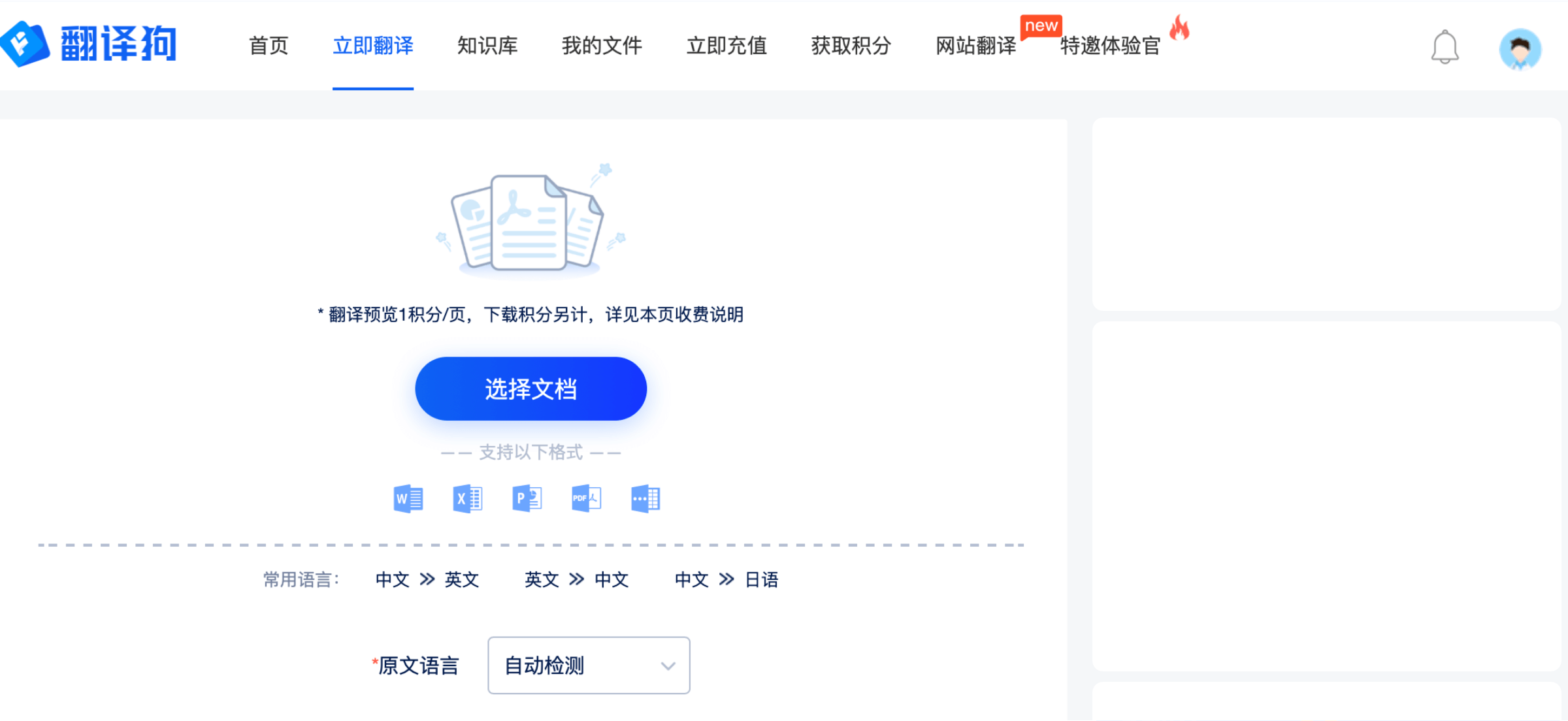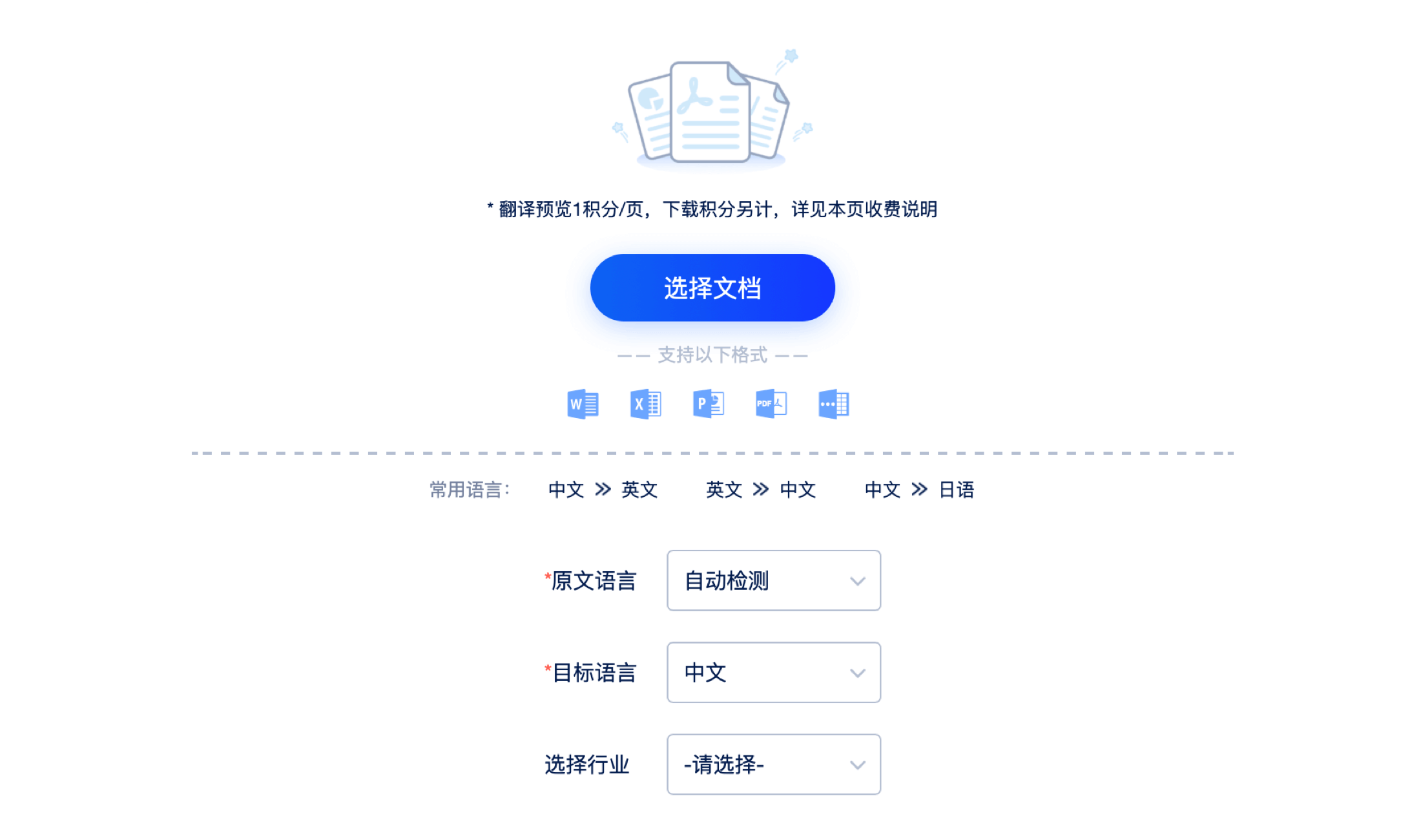 点击【立即翻译】按钮,进入翻译页面→点击【选择文档】上传目标文档(现支持PDF、DOC、DOCX、XLSX、XLS、PPT、PPTX、dps、dpt、txt、rtf等格式)→依次选择原文语言、目标语言、行业,即可进行翻译