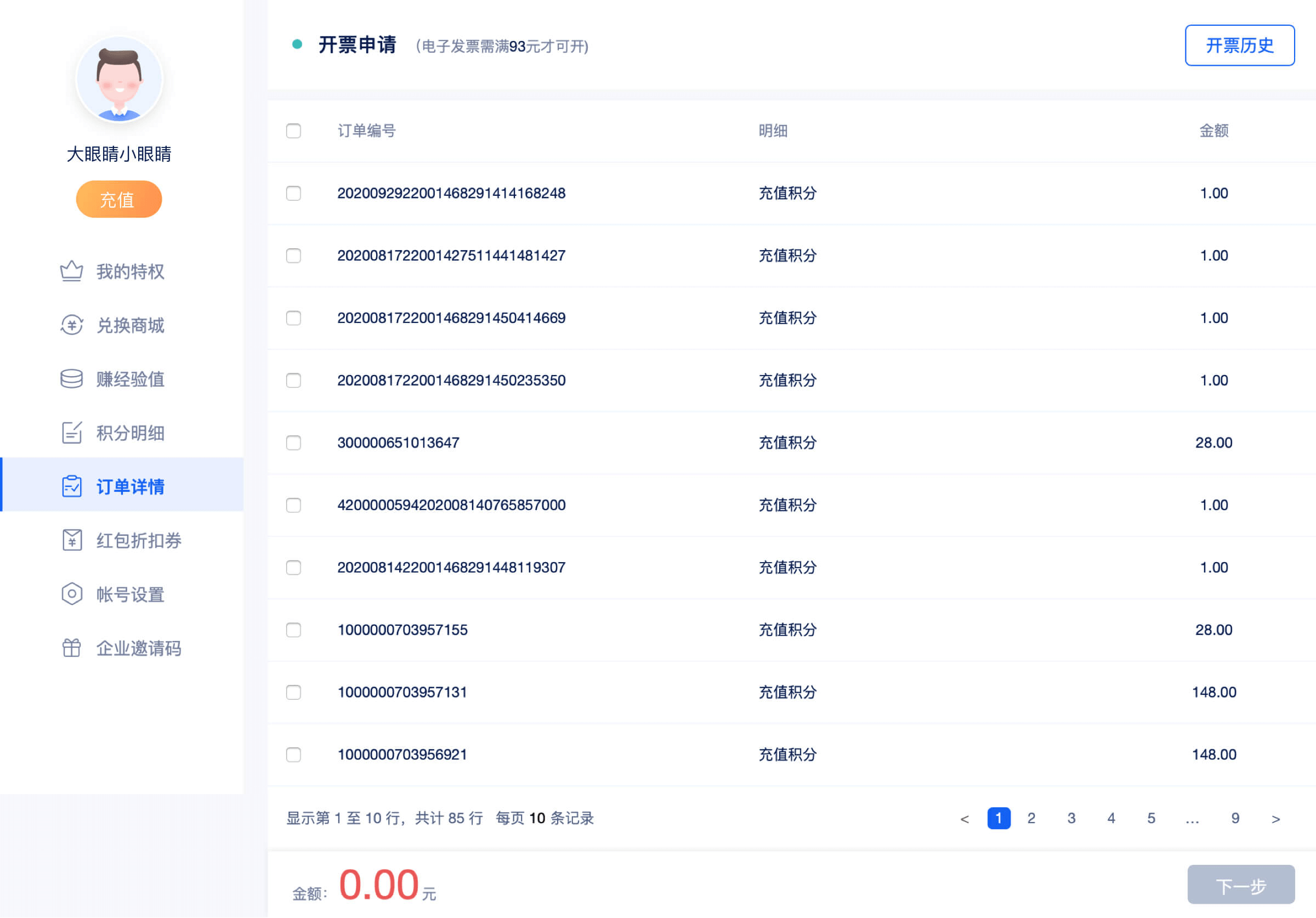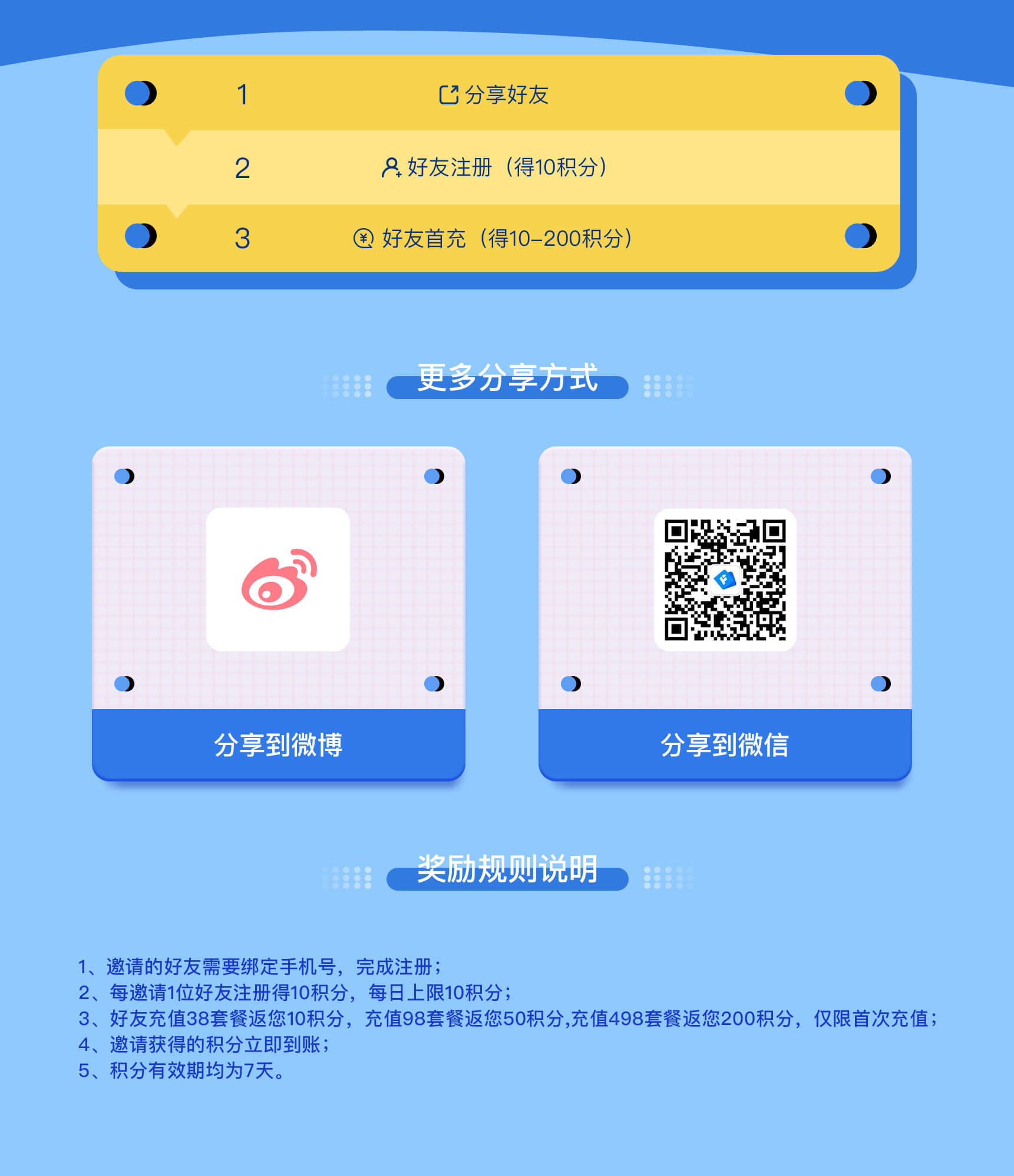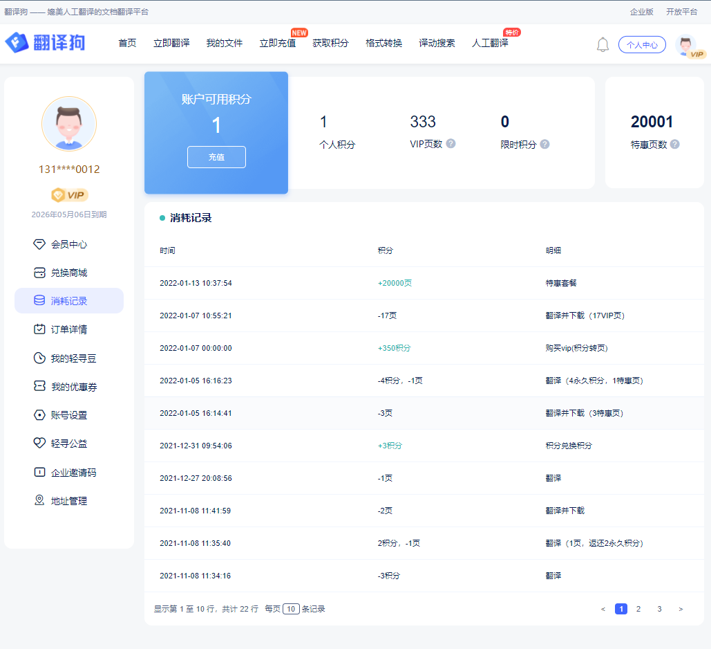 该页面可以查看个人账户剩余积分及组成,积分获得、消耗明细,如积分不足,可以直接点击充值