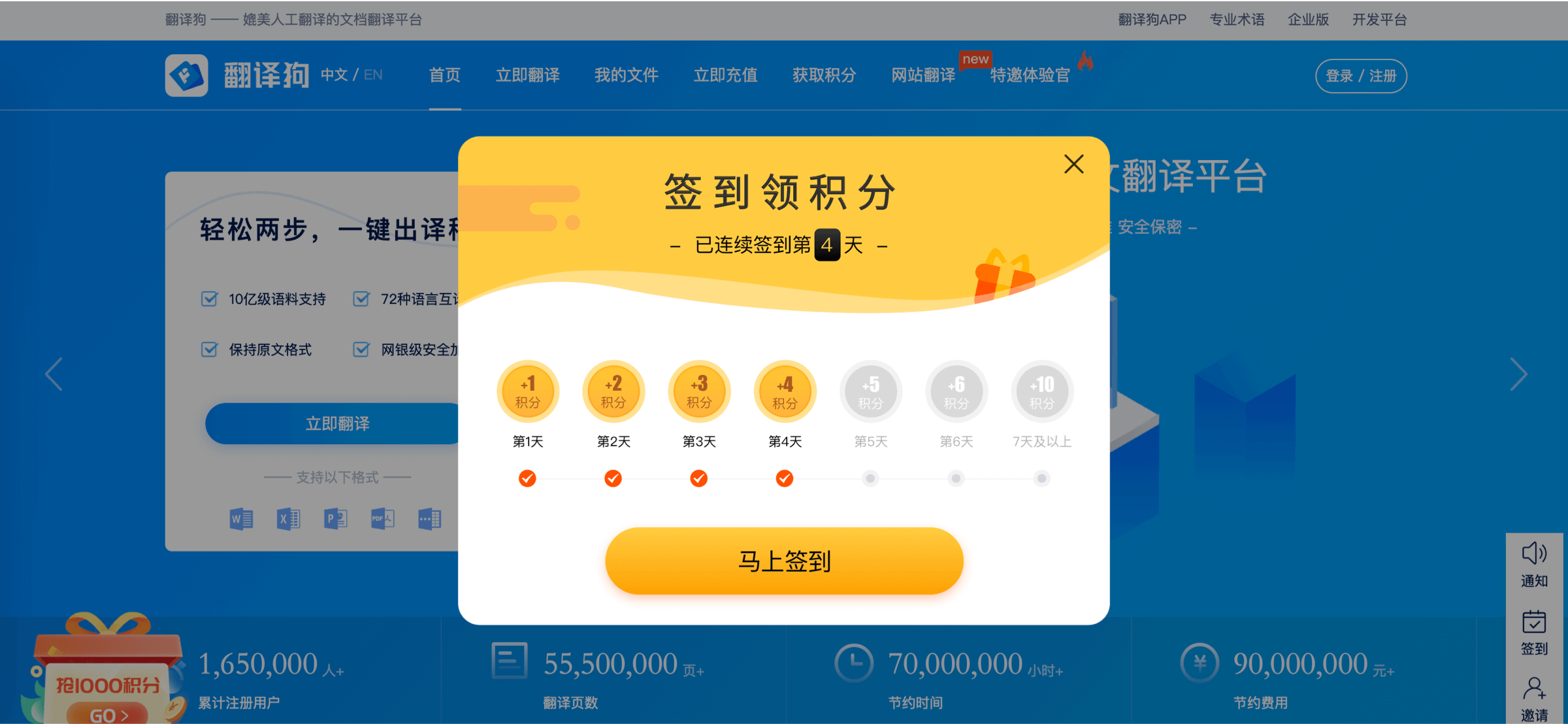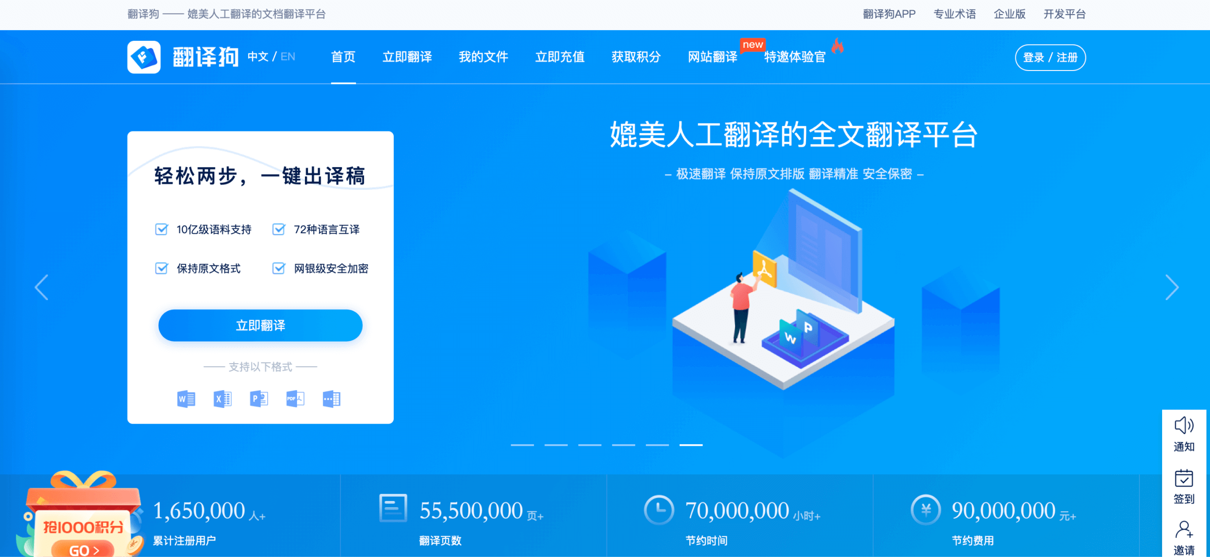 翻译狗官网菜单栏目前拥有的功能包括:【立即翻译】、【我的文件】、【立即充值】、【获取积分】、【网站翻译】、【APP下载】、【专业术语】、【企业版】、【开发者平台】、【账户设置】