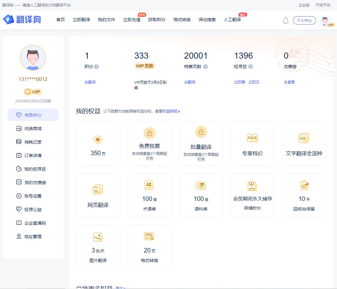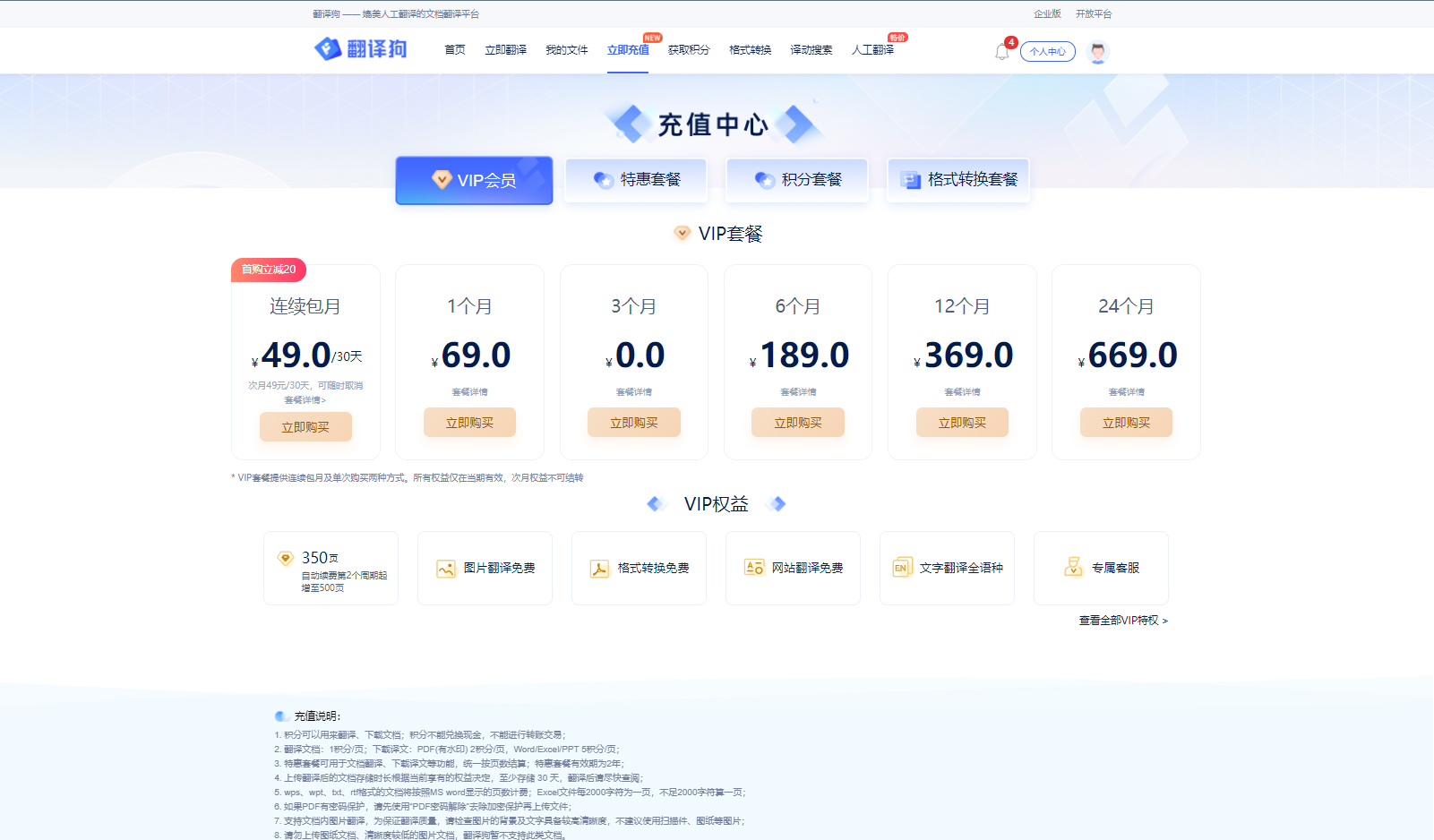 VIP 会员可在服务期间获得 350 页、无限次格式转换等15项权益。提供多种购买方式:连续包月(49元/月)、1个月69元、3个月99元,6个月189 元,1年369 元,2年669元;连续包月仅限使用支付宝进行购买。