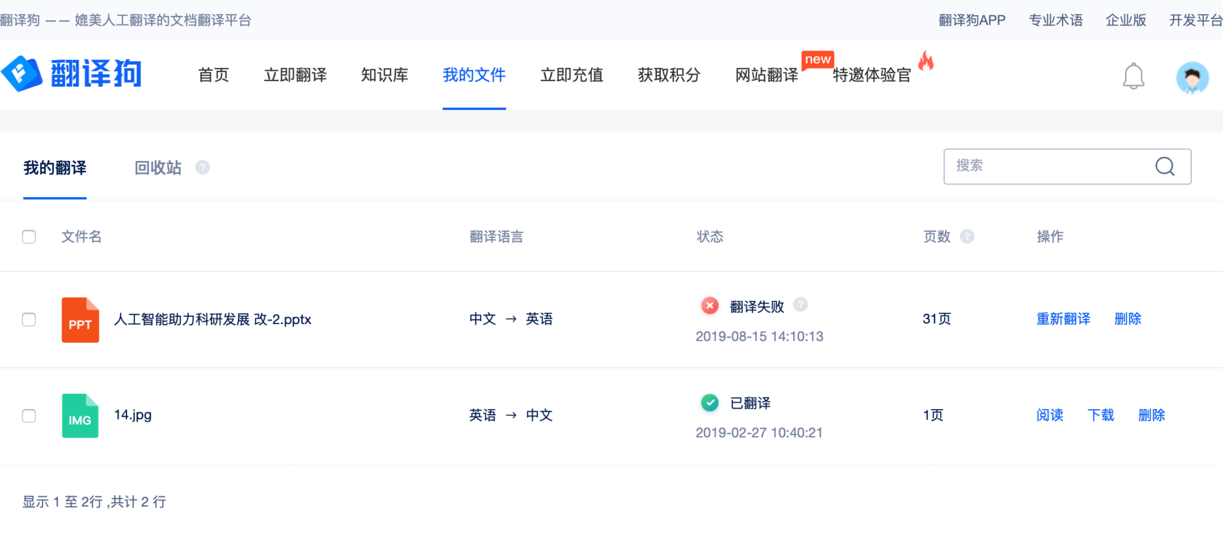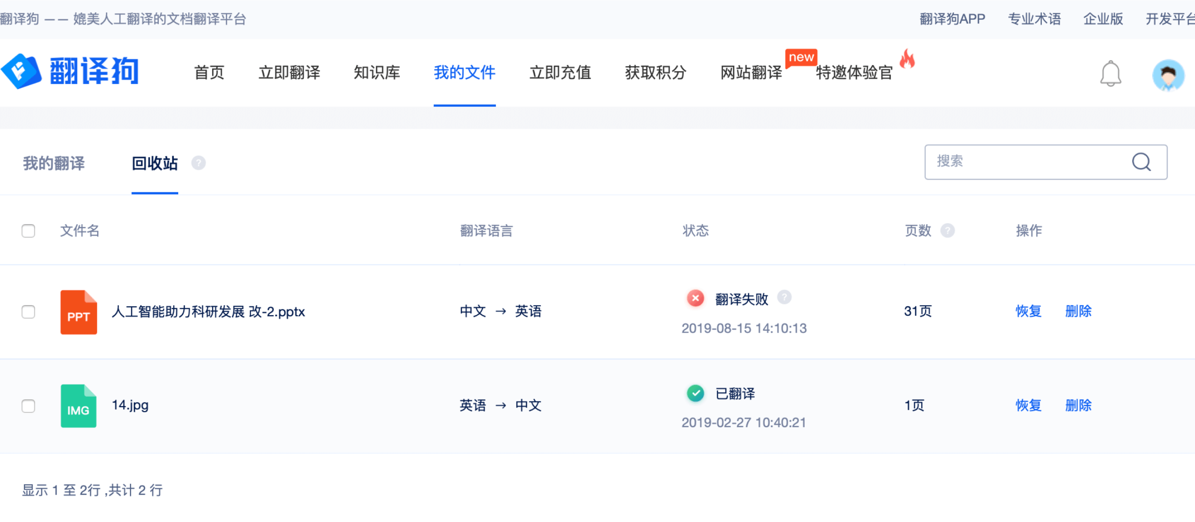 【我的文件】→【我的翻译】页面,分为“我的翻译”、“回收站”和“搜索栏”
