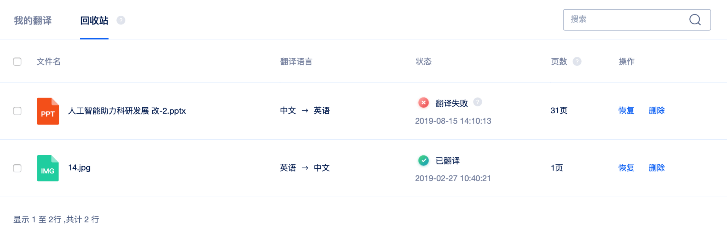 该界面内可以查看到该账户所有的翻译记录,包含:文档名、翻译语言、翻译状态、页数,还可以进行阅读、下载、删除操作。删除操作支持全选,复选或者单选,被删除的文档可在回收站内查看