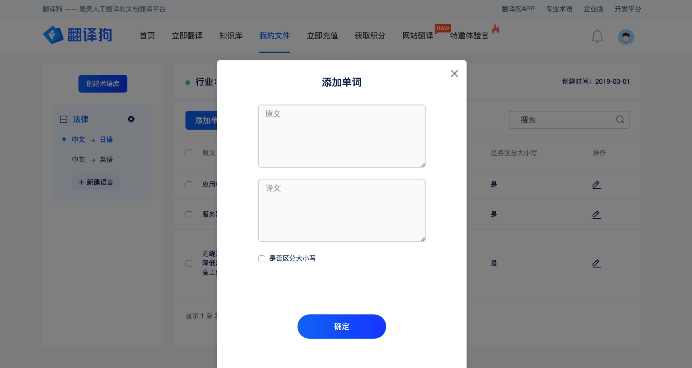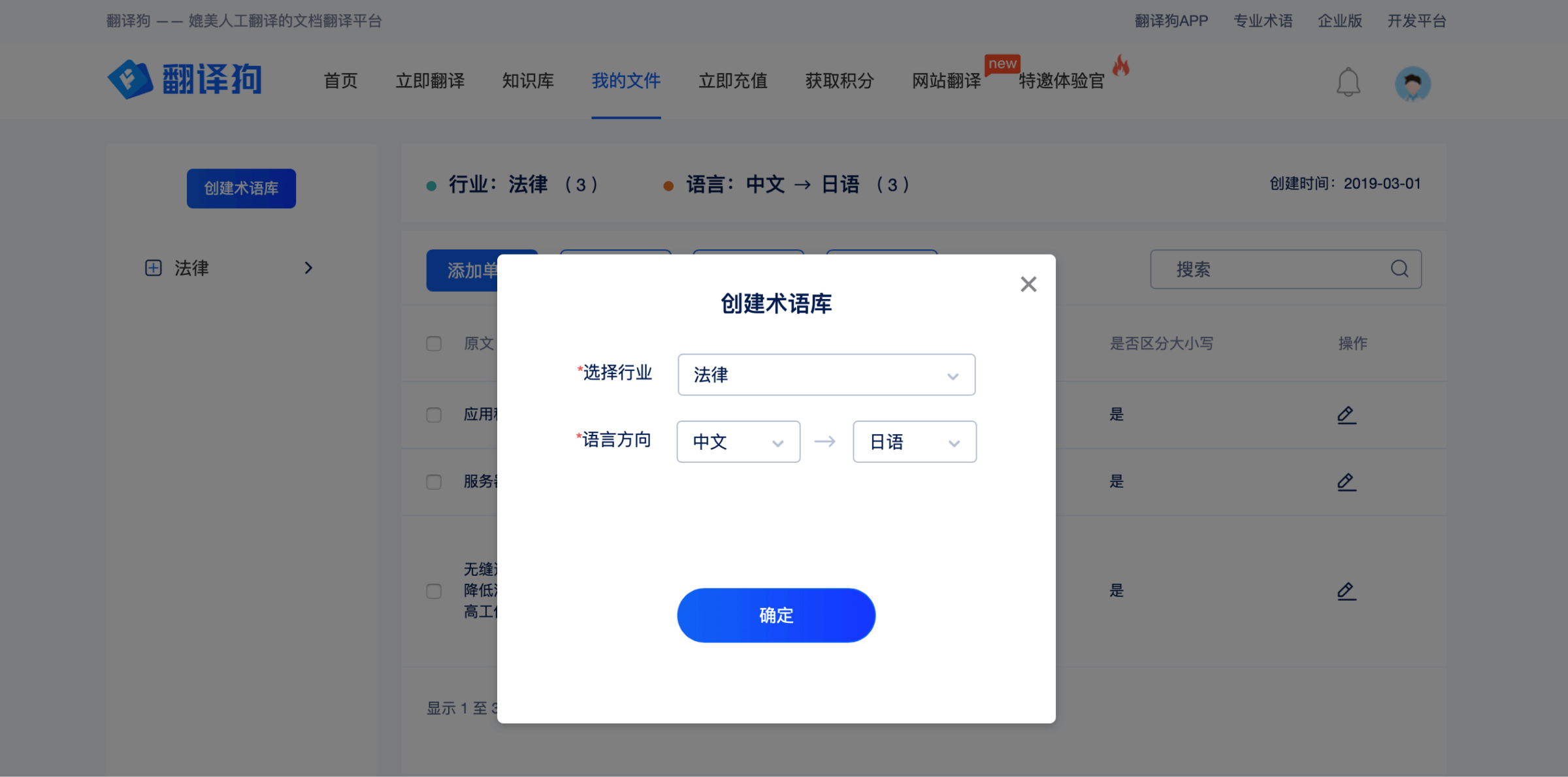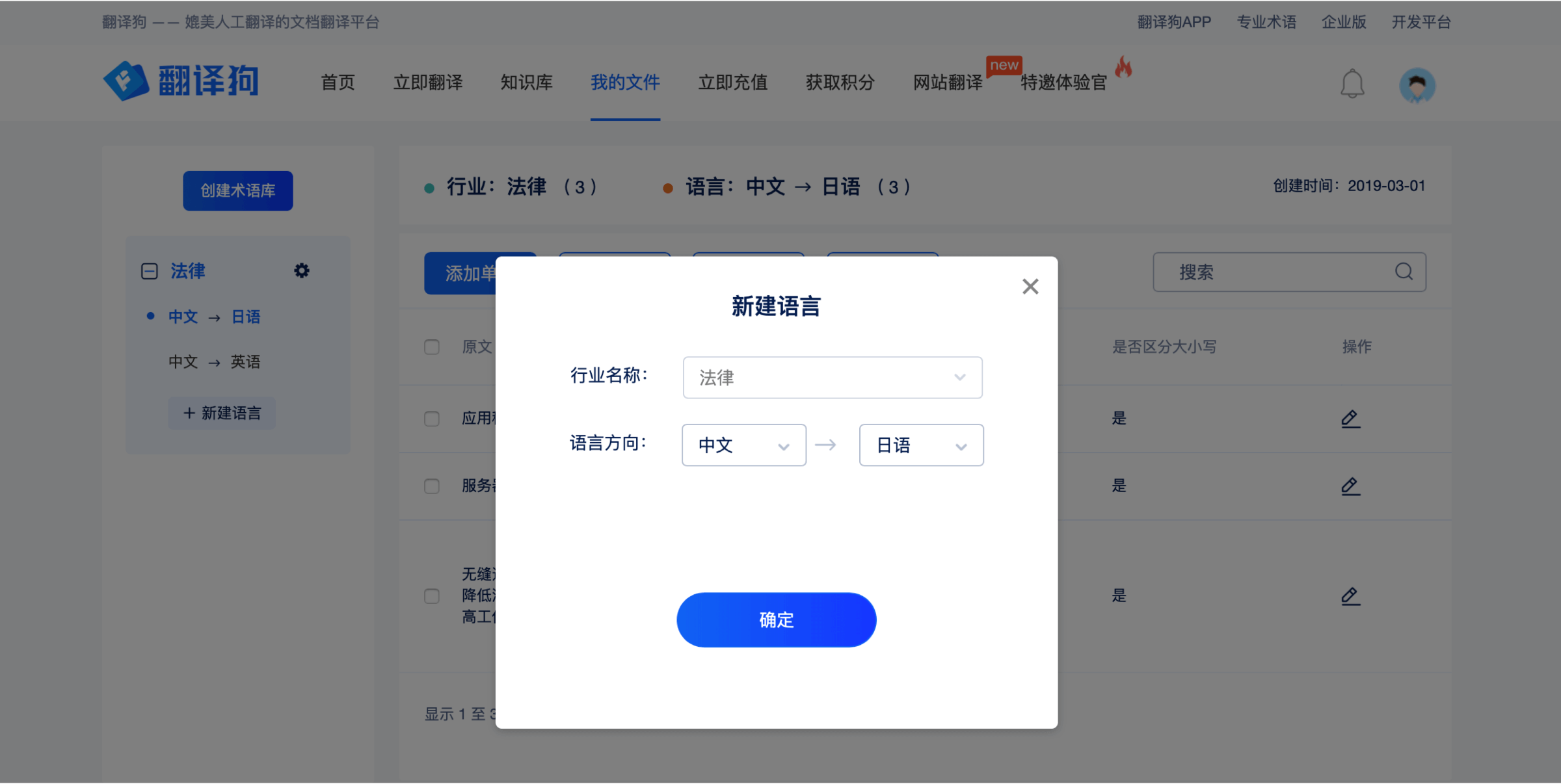 点击导航栏【专业术语】,进入专业术语界面。点击“创建术语库” →选择行业、语言方向→点击【确定】即可创建