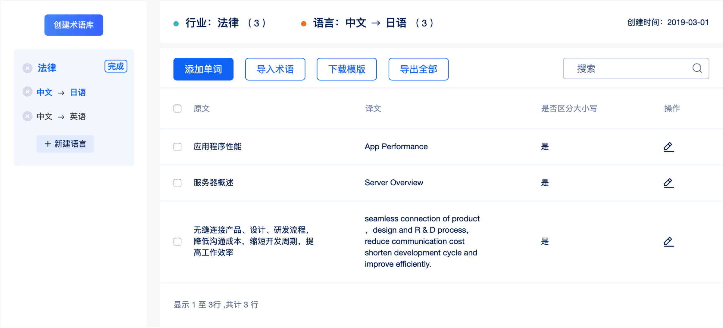 通过“添加单词”、“导入术语”、“下载模板”、“导出全部”、“删除”、“导出”功能,可以对个人的专业词库进行管理,通过搜索栏可以快速找到某个词汇